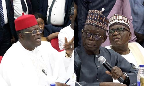 Minister of Works David Umahi and Senator Adams Oshiomhole (Edo North) engaged in a tense verbal confrontation on Wednesday during a Senate session reviewing the N15 trillion Lagos-Calabar coastal highway project.
